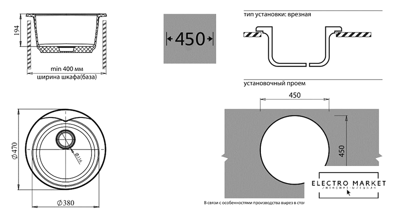 врезная на столешницу, искусственный камень, размеры: 47x47 см, в шкаф 45 см
