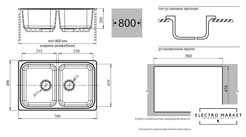 врезная на столешницу, искусственный камень, размеры: 78x49.6 см, в шкаф 80 см
