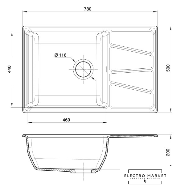 врезная на столешницу, искусственный камень, размеры: 78x50 см, в шкаф 60 см
