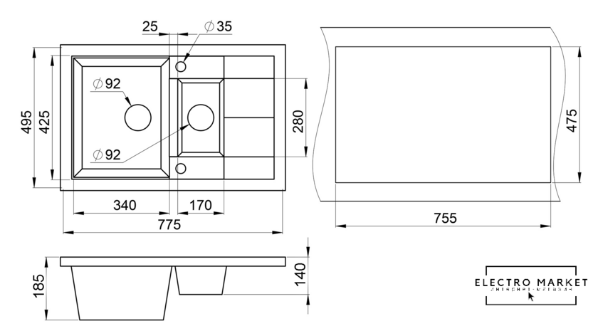 врезная на столешницу, искусственный камень, размеры: 77.5x49.5 см, в шкаф 60 см