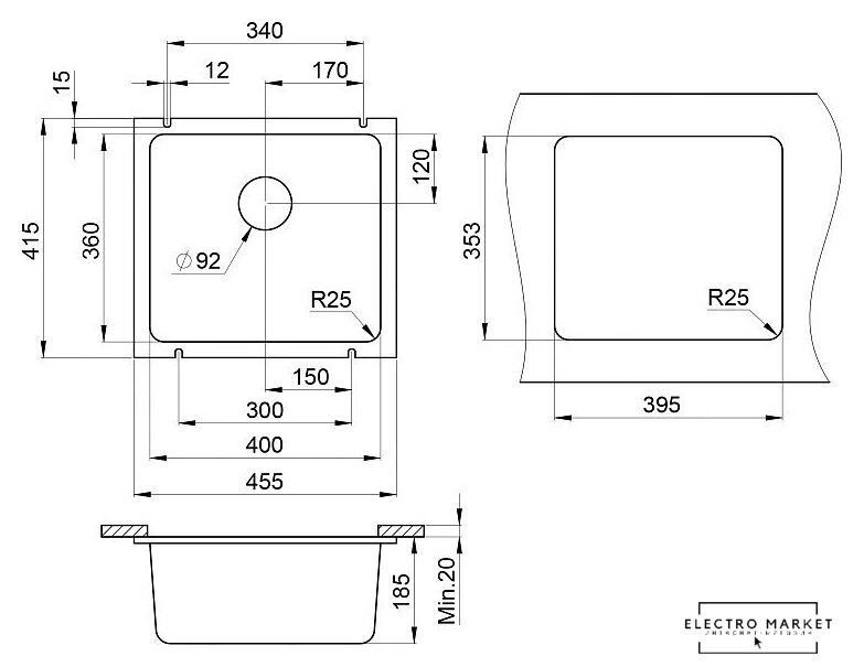 врезная под столешницу, искусственный камень, размеры: 41.5x45.5 см, в шкаф 50 см