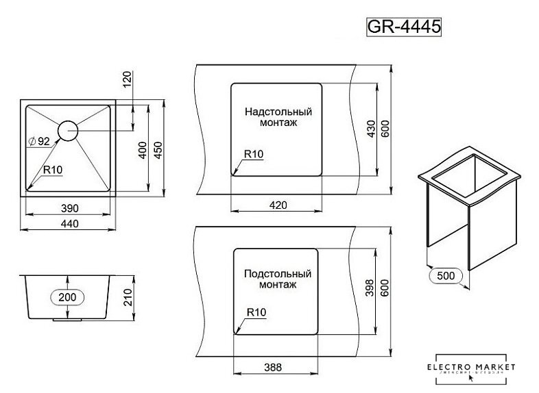 врезная на столешницу, гранит, фактура: матовая, размеры: 51x50.5 см, глубина чаши: 19 см, в шкаф шириной от 50 см