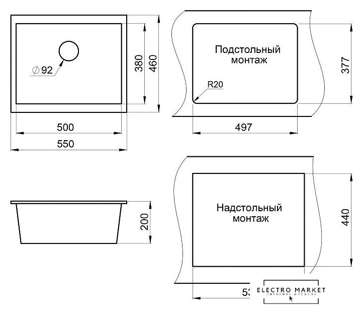 врезная на столешницу/врезная вровень со столешницей/врезная под столешницу, искусственный камень, фактура: матовая, размеры: 46x55.5 см, глубина чаши: 20 см, в шкаф шириной от 60 см