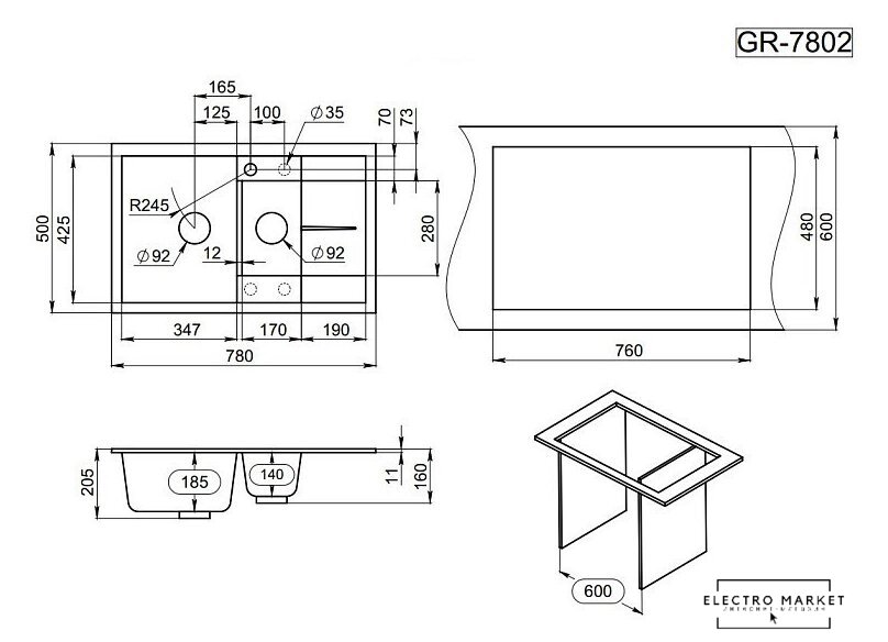 врезная под столешницу, искусственный камень, размеры: 55.5x46 см, глубина чаши: 19 см, в шкаф шириной от 60 см