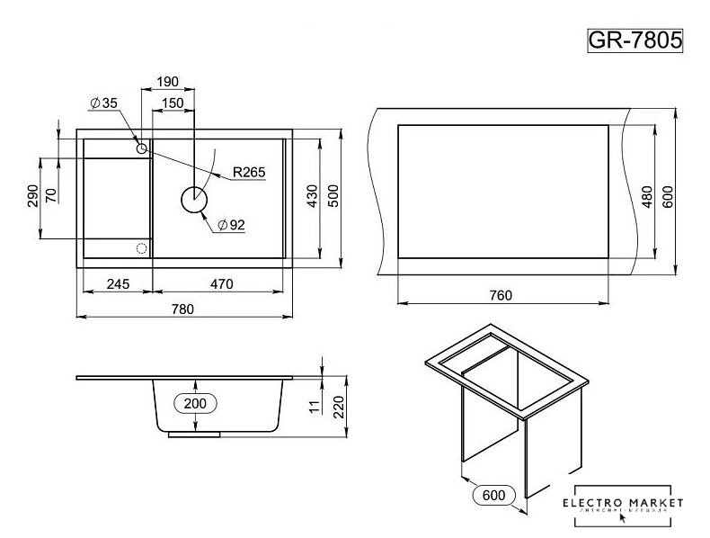 врезная на столешницу, искусственный камень, размеры: 60x50 см, глубина чаши: 20 см, в шкаф шириной от 50 см