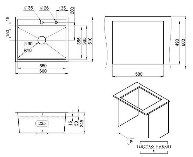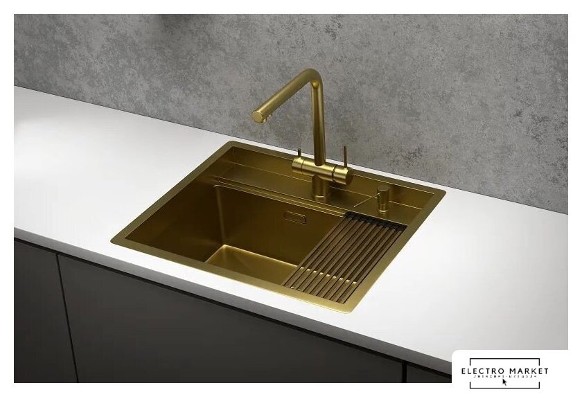 врезная на столешницу/врезная под столешницу, искусственный камень, размеры: 56x51 см, глубина чаши: 20 см, в шкаф шириной от 60 см, клапан-автомат