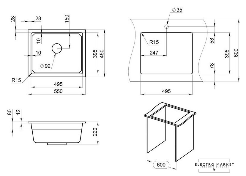 врезная под столешницу, кварц, размеры: 55x45 см, в шкаф 60 см