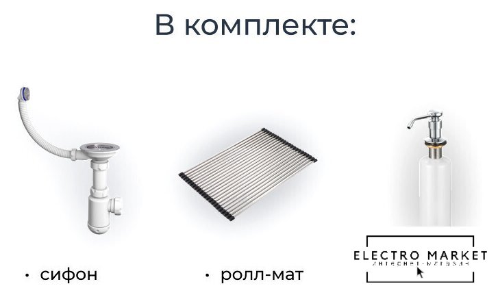 | Комплектация | Сифон, дозатор для жидкого мыла (нерж) и ролл-мат |