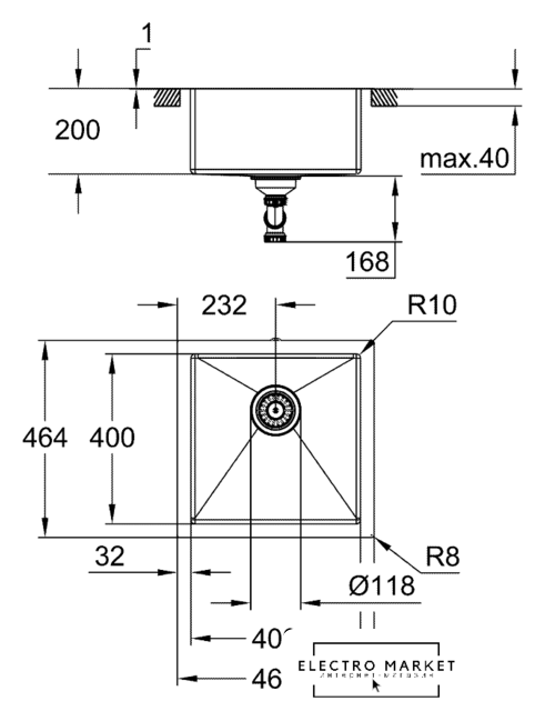врезная вровень со столешницей, нержавеющая сталь, размеры: 40x44 см, глубина чаши: 20 см, в шкаф шириной от 80 см