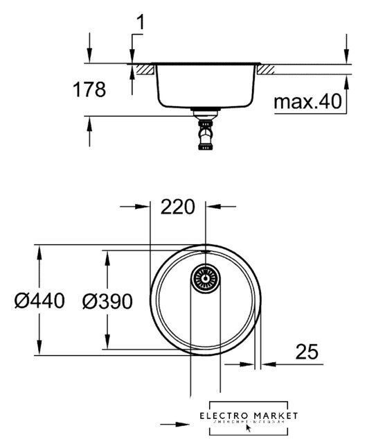 врезная вровень со столешницей, нержавеющая сталь, размеры: 40x44 см, глубина чаши: 20 см, в шкаф шириной от 50 см