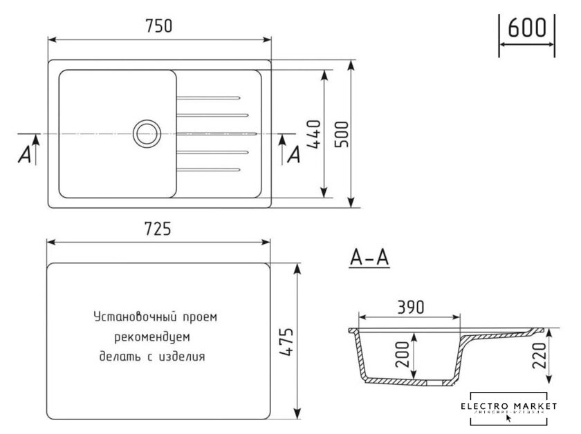врезная на столешницу, искусственный камень, размеры: 65x50 см, глубина чаши: 19.5 см, в шкаф шириной от 50 см