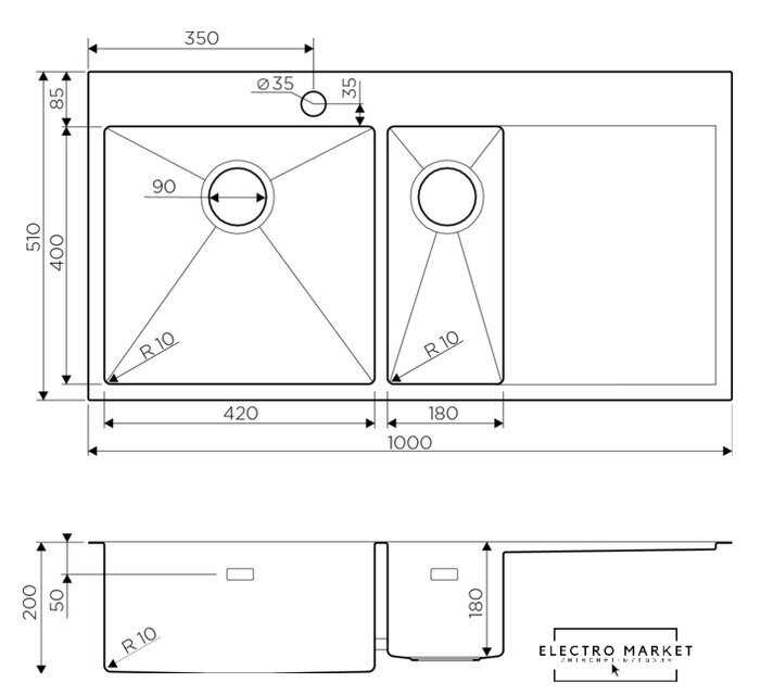 врезная на столешницу, нержавеющая сталь, фактура: матовая/полированная, размеры: 78x51 см, глубина чаши: 20 см, в шкаф шириной от 60 см, клапан-автомат