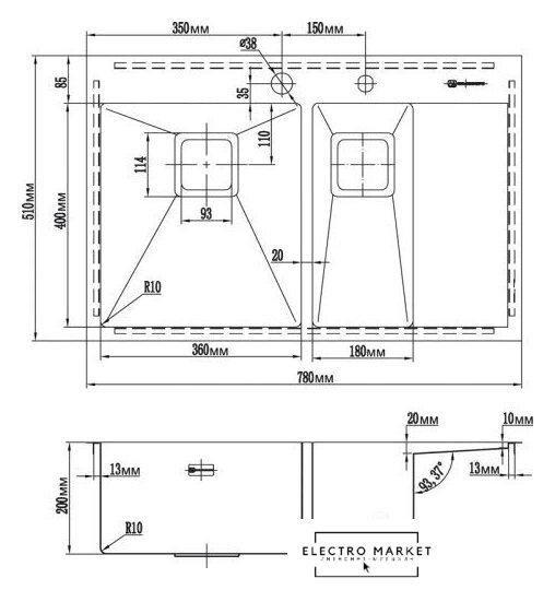 врезная на столешницу, нержавеющая сталь, фактура: матовая/полированная, размеры: 78x51 см, глубина чаши: 20 см, в шкаф шириной от 60 см, клапан-автомат