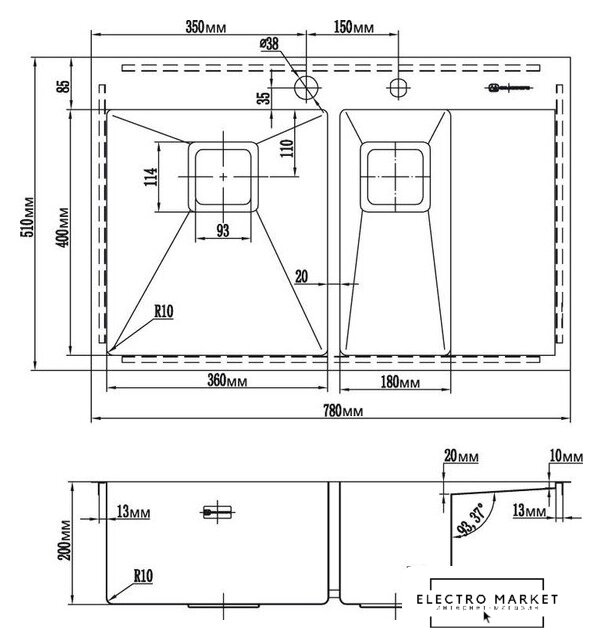 врезная на столешницу, нержавеющая сталь, фактура: матовая/полированная, размеры: 78x51 см, глубина чаши: 20 см, в шкаф шириной от 60 см, клапан-автомат