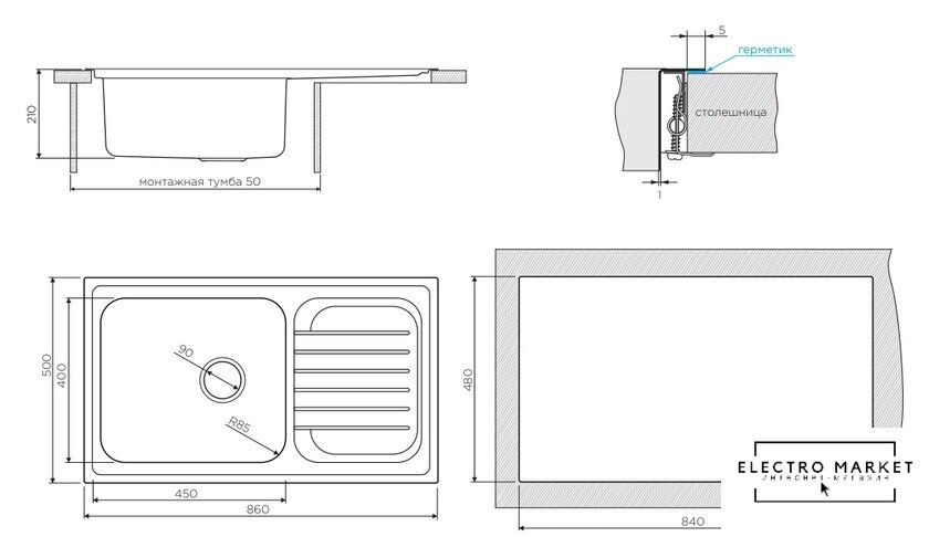 врезная на столешницу, нержавеющая сталь, размеры: 52x49 см, глубина чаши: 23 см, в шкаф шириной от 60 см