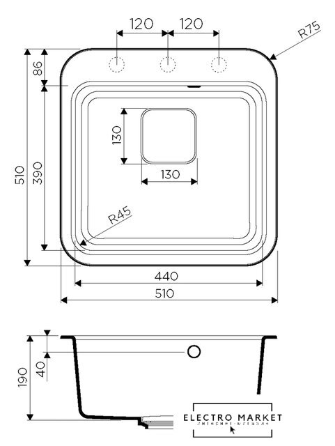 нержавеющая сталь, фактура: полированная, размеры: 44x39 см, глубина чаши: 20 см, в шкаф шириной от 50 см