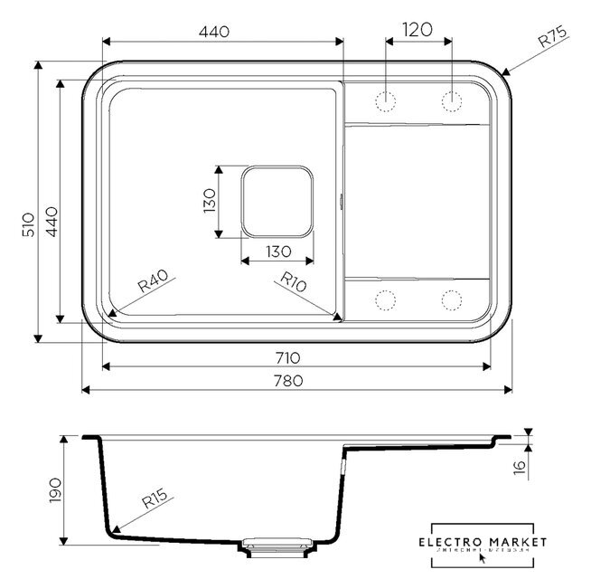 врезная на столешницу, искусственный камень, размеры: 78x51 см, в шкаф 50 см