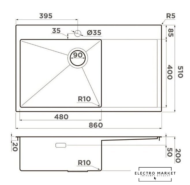 врезная на столешницу, нержавеющая сталь, размеры: 86x51 см, в шкаф 60 см