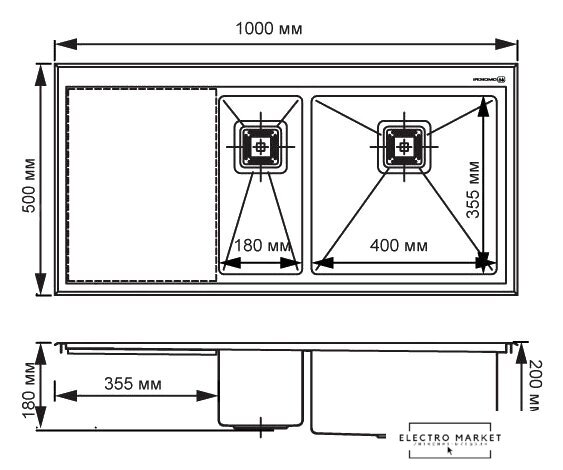 врезная на столешницу, нержавеющая сталь, фактура: матовая/полированная, размеры: 100x51 см, глубина чаши: 20 см, в шкаф шириной от 90 см, клапан-автомат