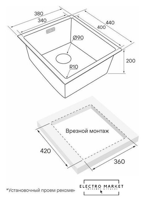 врезная под столешницу, нержавеющая сталь, фактура: матовая, размеры: 44x44 см, глубина чаши: 20 см, в шкаф шириной от 45 см