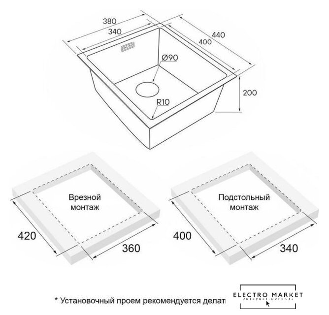 врезная под столешницу/врезная на столешницу/врезная вровень со столешницей, нержавеющая сталь, размеры: 44x48 см, в шкаф 50 см