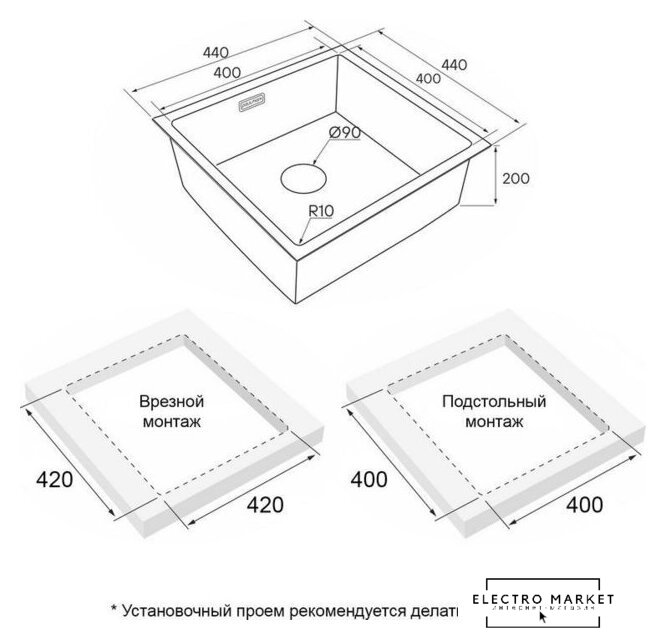 врезная под столешницу/врезная на столешницу/врезная вровень со столешницей, нержавеющая сталь, размеры: 44x48 см, в шкаф 50 см