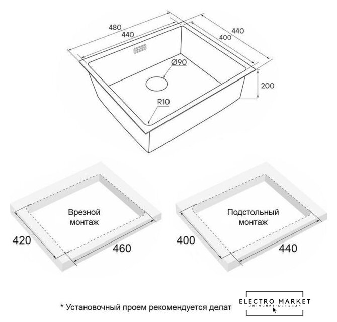 врезная на столешницу/врезная вровень со столешницей/врезная под столешницу, нержавеющая сталь, размеры: 44x48 см, в шкаф 50 см