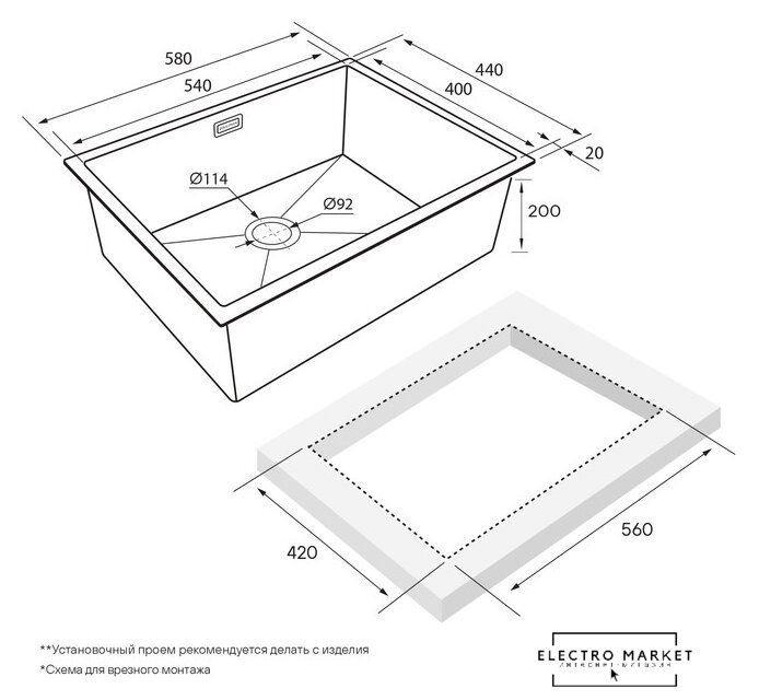 врезная на столешницу/врезная под столешницу, нержавеющая сталь, размеры: 44x58 см, в шкаф 60 см