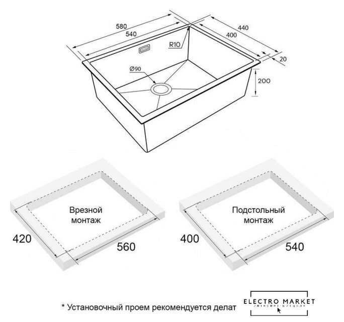врезная на столешницу/врезная под столешницу/врезная вровень со столешницей, нержавеющая сталь, фактура: матовая, размеры: 54x44 см, глубина чаши: 20 см, в шкаф шириной от 60 см