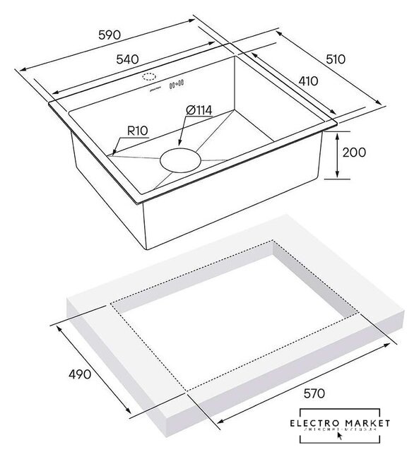 врезная на столешницу/врезная вровень со столешницей/врезная под столешницу, нержавеющая сталь, размеры: 59x51 см, в шкаф 60 см