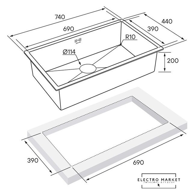 врезная на столешницу/врезная под столешницу/врезная вровень со столешницей, нержавеющая сталь, размеры: 74x44 см, в шкаф 80 см