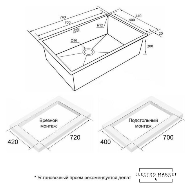 врезная под столешницу/врезная на столешницу/врезная вровень со столешницей, нержавеющая сталь, размеры: 44x74 см, в шкаф 80 см