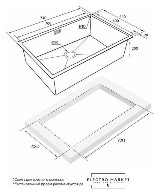врезная вровень со столешницей/врезная на столешницу/врезная под столешницу, нержавеющая сталь, размеры: 44x74 см, глубина чаши: 20 см