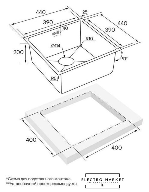 врезная под столешницу/врезная на столешницу/врезная вровень со столешницей, нержавеющая сталь, размеры: 44x48 см, в шкаф 50 см