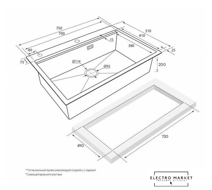 врезная на столешницу/врезная вровень со столешницей, нержавеющая сталь, размеры: 51x75 см, глубина чаши: 20 см, в шкаф шириной от 80 см