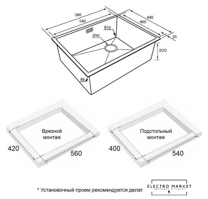Способ установки | врезная на столешницу, врезная под столешницу, врезная вровень со столешницей |