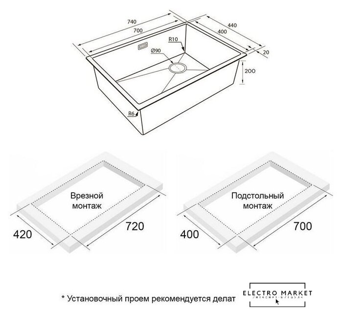 врезная на столешницу/врезная под столешницу/врезная вровень со столешницей, нержавеющая сталь, размеры: 74x44 см, глубина чаши: 20 см, в шкаф шириной от 80 см
