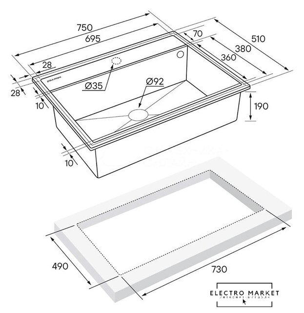 врезная на столешницу, искусственный камень, размеры: 75x51 см, глубина чаши: 19 см, в шкаф шириной от 80 см