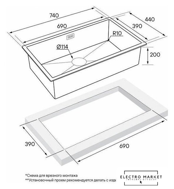 врезная на столешницу/врезная под столешницу/врезная вровень со столешницей, нержавеющая сталь, размеры: 74x44 см, в шкаф 80 см