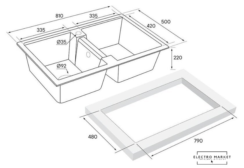врезная под столешницу, искусственный камень, фактура: матовая, размеры: 48x81 см, глубина чаши: 23 см, в шкаф шириной от 50 см