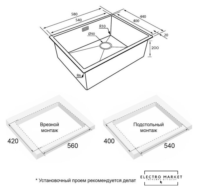 Способ установки | врезная на столешницу, врезная под столешницу, врезная вровень со столешницей |