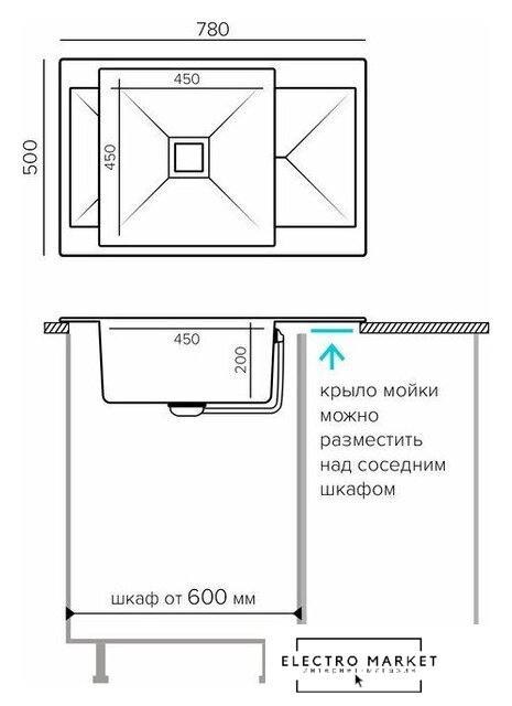 врезная на столешницу, искусственный камень, размеры: 78x50 см, в шкаф 60 см