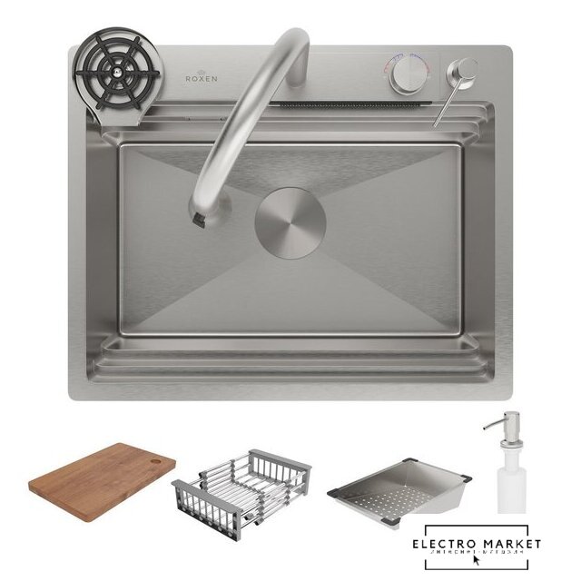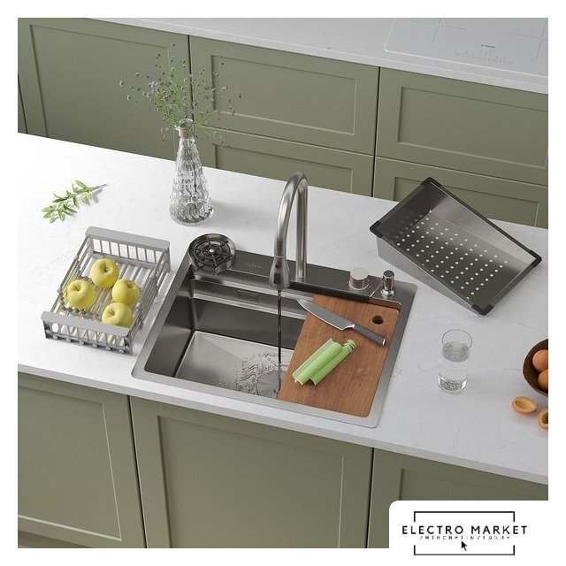 | Комплектация | ✅Смеситель✅Ринзер (омыватель стаканов)✅Доска разделочня✅Сифон✅Дозатор для моющих средств✅Коландер телескопический✅Коландер ✅Корзинчатый вентиль с декоративной накладкой✅Комплект креплений к столешнице |