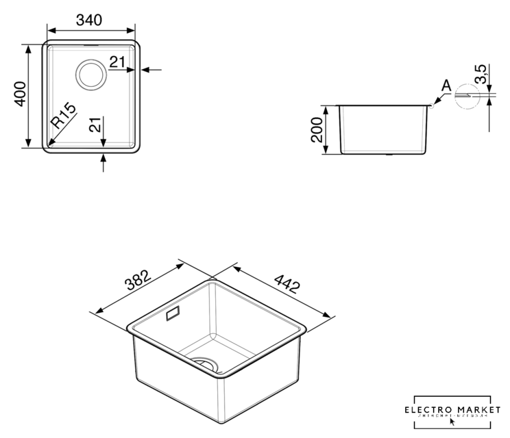 врезная вровень со столешницей, нержавеющая сталь, размеры: 40x44 см, глубина чаши: 20 см, в шкаф шириной от 55 см