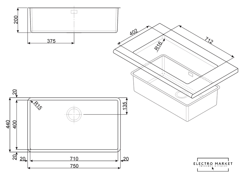 врезная на столешницу/врезная под столешницу/врезная вровень со столешницей, нержавеющая сталь, фактура: матовая, размеры: 44x44 см, глубина чаши: 20 см, в шкаф шириной от 45 см
