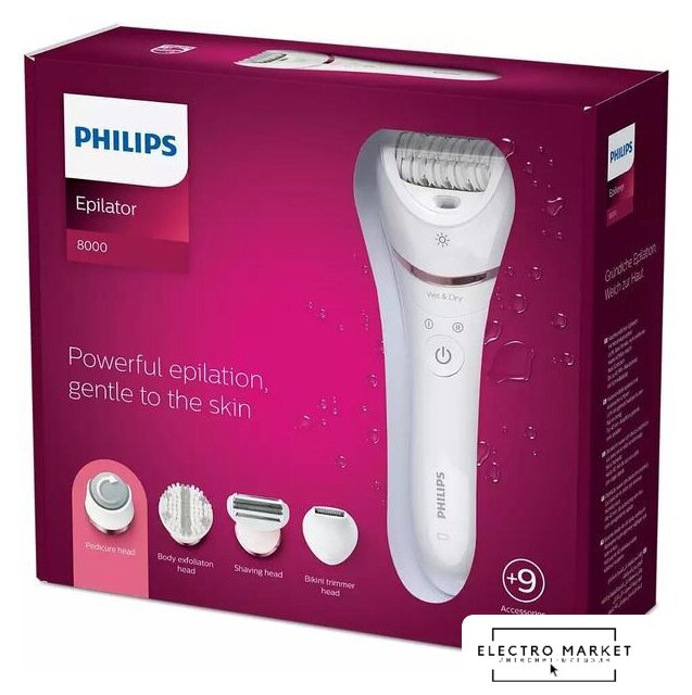 эпилятор, количество режимов: 2, массажер, насадка для бритья, триммер, подсветка, питание от аккумулятора/батареек