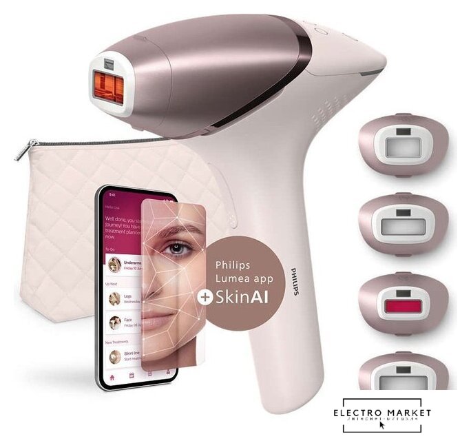 Комплект поставки | Аппарат IPL серии 9900 для удаления легких волосИнтеллектуальная насадка для эпиляции лицаИнтеллектуальная насадка для эпиляции зоны бикиниИнтеллектуальная насадка для эпиляции подмышекПриложение Lumea IPL с эксклюзивными функциями SkinAIРоскошный футляр |