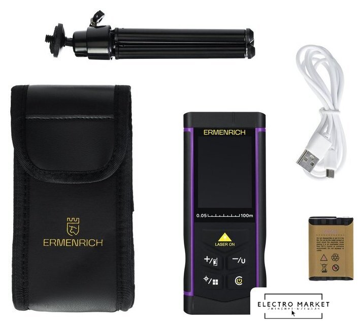 | Комплект поставки | Лазерная рулетка, настольный штатив, ремешок на руку, аккумулятор, USB-кабель для зарядки, чехол, инструкция по эксплуатации и гарантийный талон. |