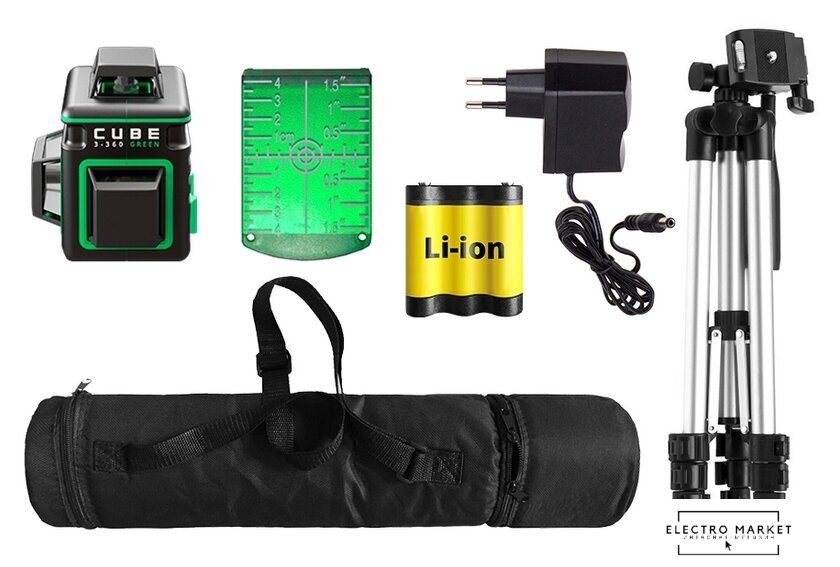 Комплект поставки | - Лазерный уровень- Телескопический штатив- Лазерная мишень- Сумка-тубус- Литиевый аккумулятор- Инструкция |