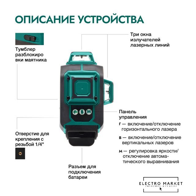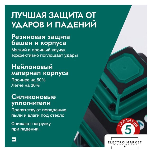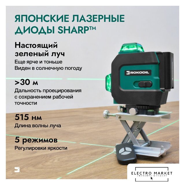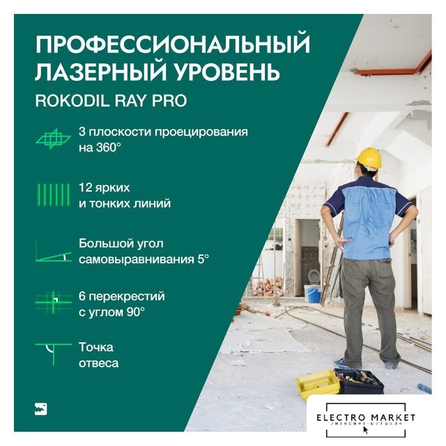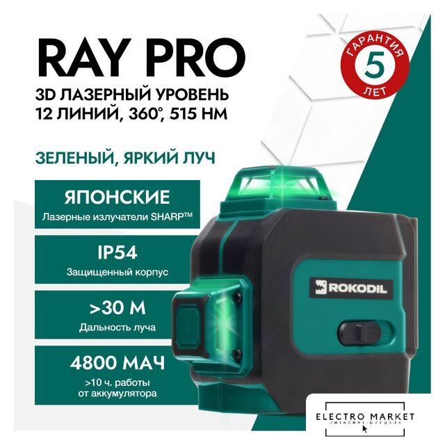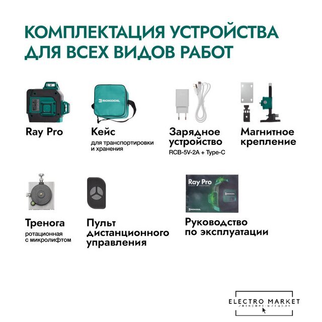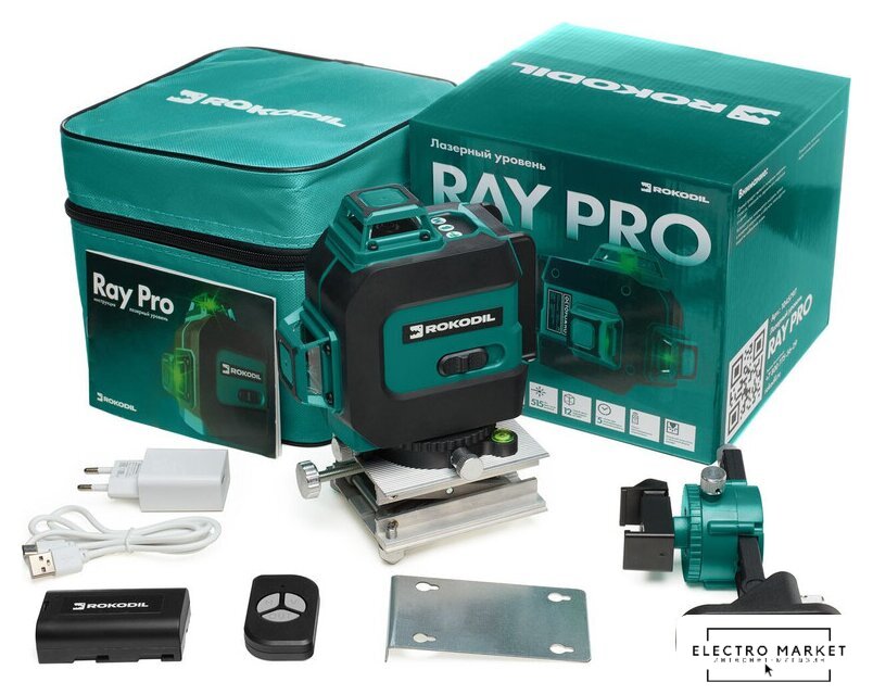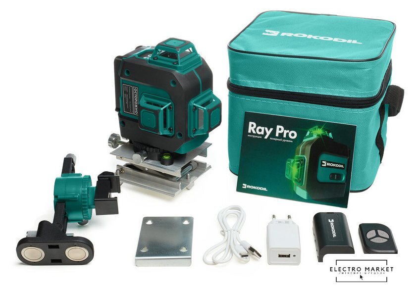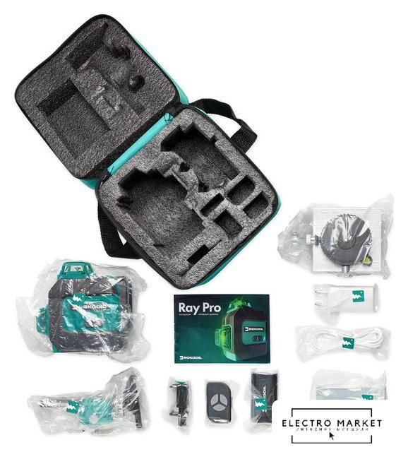 | Комплект поставки | - Лазерный уровень Rokodil Ray Pro- Литий-ионный аккумулятор RBB-3.7V-4.8A - 1 шт.- Зарядное устройство RCB-5V-2A - 1 шт.- Кабель Type-C - 1 шт.- Магнитное крепление на стену - 1 шт.- Пластиковый коннектор - 1 шт.- Металлическая площадка - 1 шт.- Ротационная тренога с микролифтом - 1 шт.- Пульт ДУ RRB-27A-12V - 1 шт.- Руководство по эксплуатации- Кейс для транспортировки и хранениям |